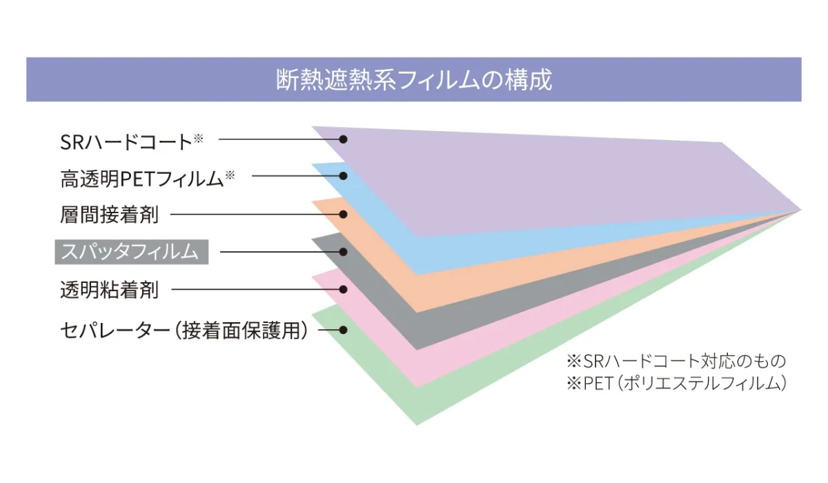 - 断熱遮熱フィルムは、「スパッタリング」や「蒸着」などと呼ばれる特殊な金属層や多層構造によって、日射熱を反射させて断熱・遮熱の効果を生み出します。特にスパッタリングを用いたフィルムは、金属に高電圧をかけてイオン化し、均一で強固な薄膜を形成させるので、効率良く熱線を反射できます。タクミでは、光学特性や熱特性のデータを詳細に測定し、用途に応じた最適な製品をご提案します。